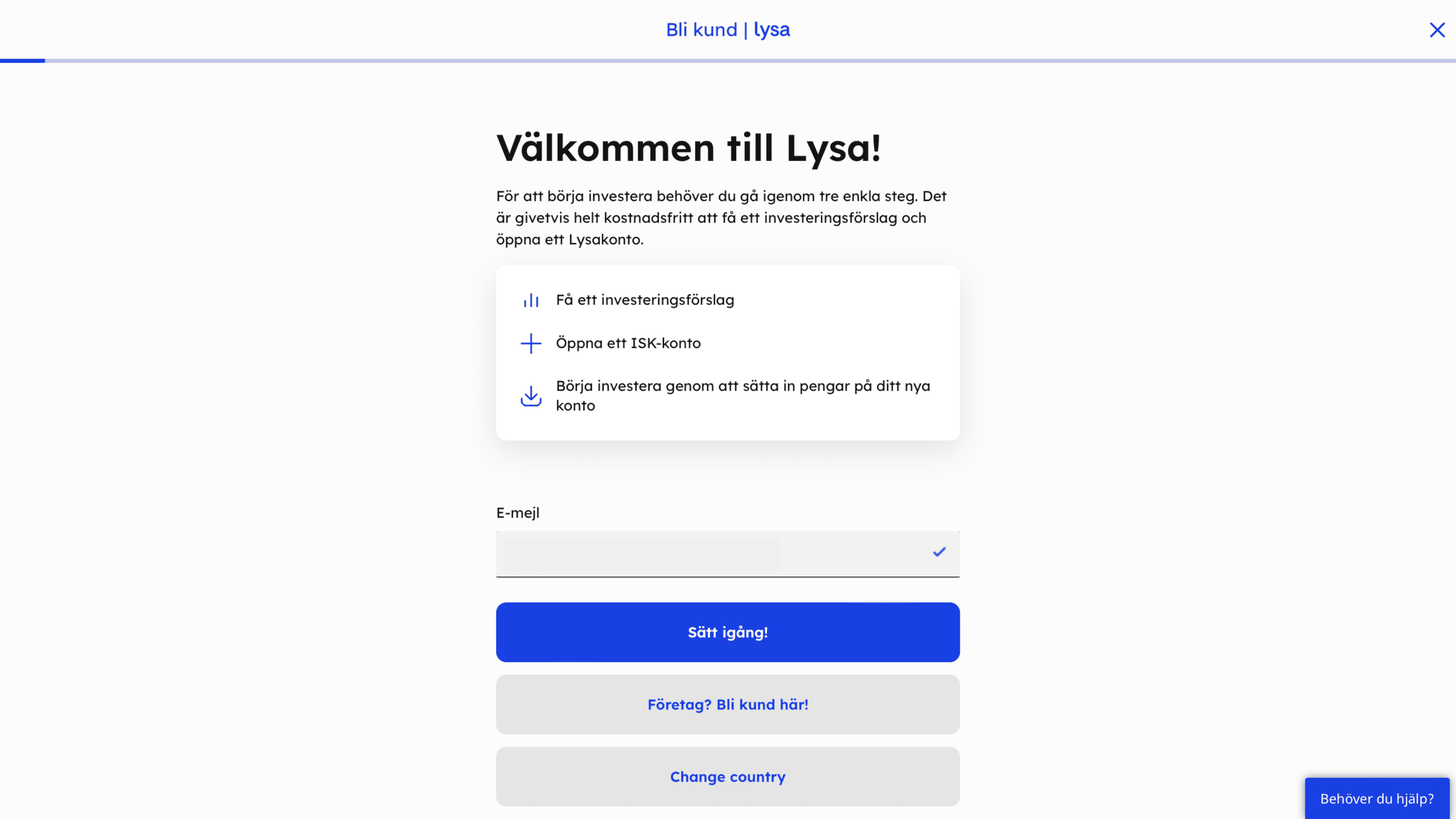 Fyll i din mailadress och klicka dig vidare på "sätt igång". Framöver kan du logga in med BankID