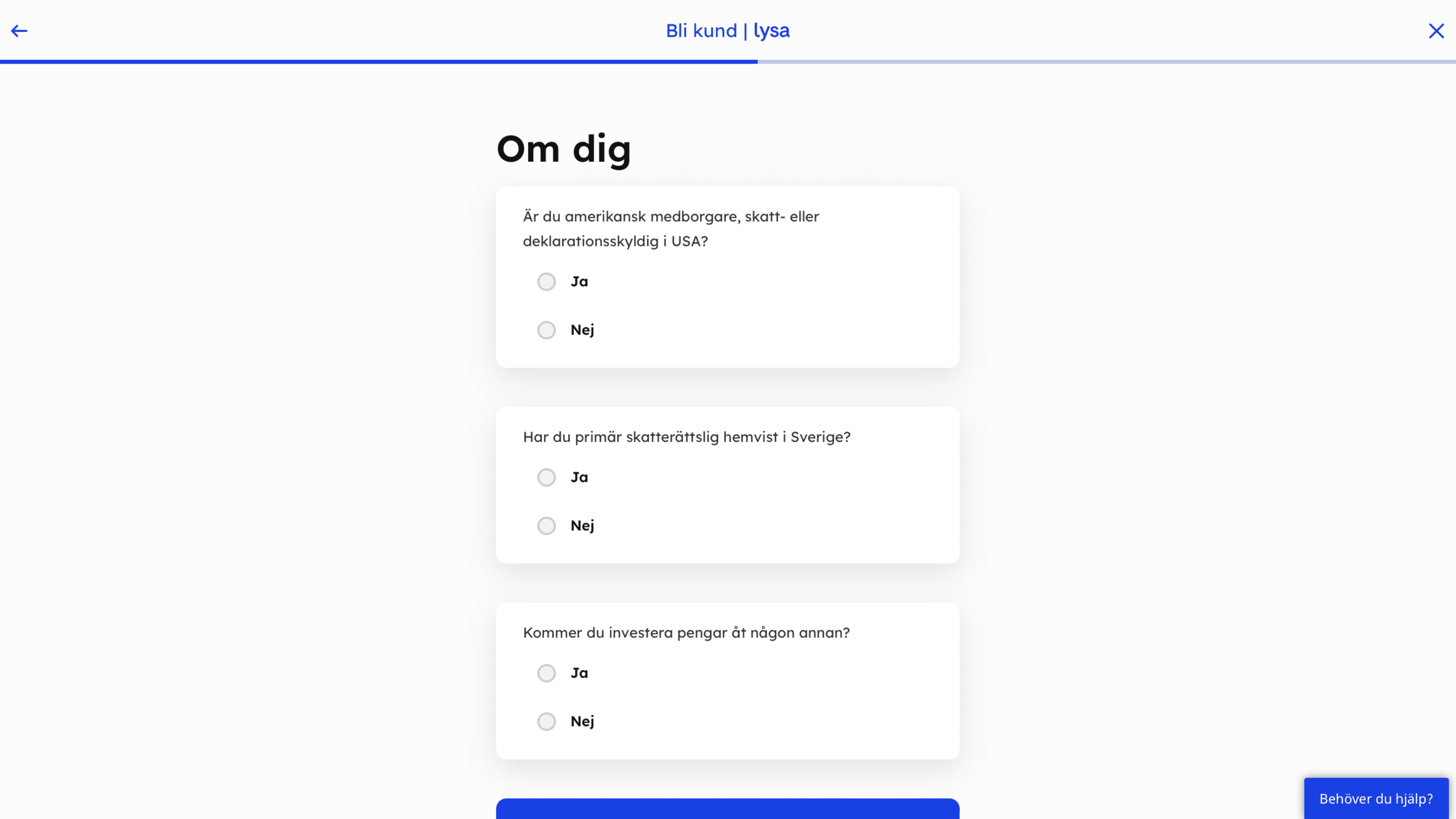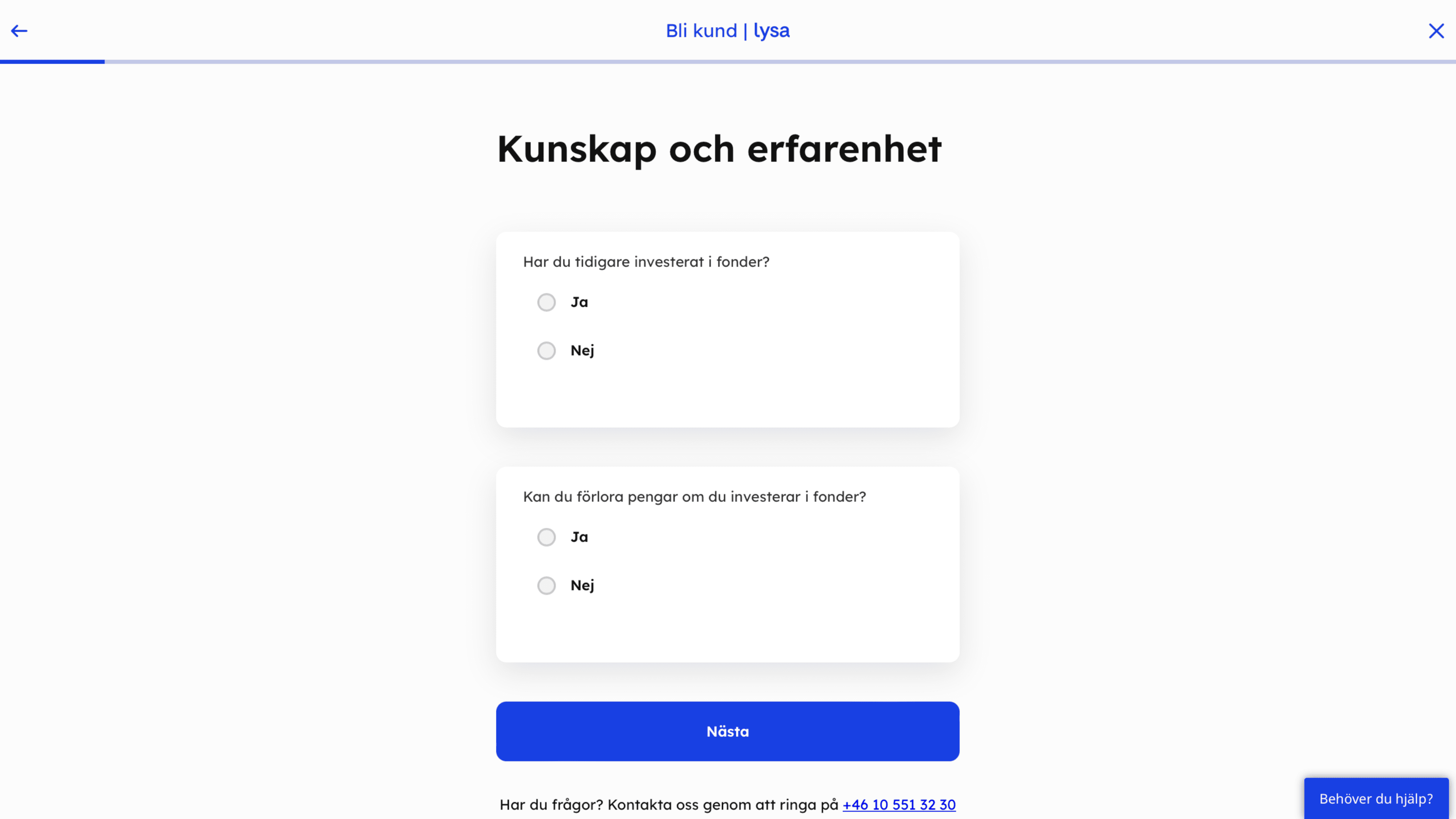 För att komma igång vill Lysas fondrobot veta hur du vill investera dina pengar. Därför får du besvara ca 20 frågor om din ekonomi och erfarenhet på börsen.