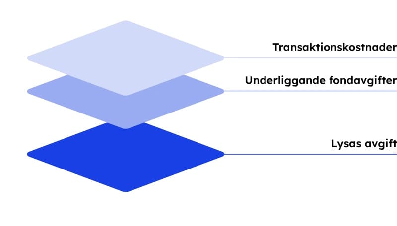 Den avgift som skall beaktas är förvaltningsavgiften för licensen. Den får inte vara högre än 0,24%. Den blir något lägre om du sparar större belopp. De fonder och ETF:er som Lysa investerar i har en förvaltningsavgift. Lysa placerar alltid i den billigaste fonden som uppfyller Lysas krav och specifikationer. Det kan till exempel vara en indexfond med låg kostnad. En transaktionsavgift tas också ut.