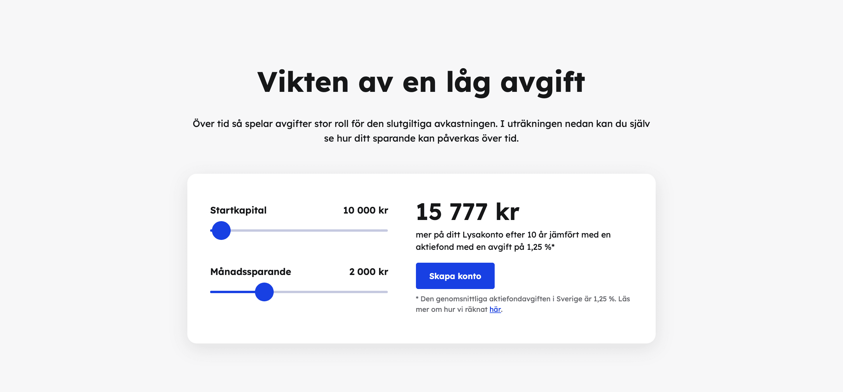 De varierar något beroende på fördelningen mellan aktier och räntan på ditt sparande. För större sparbelopp är Lysas förvaltningsavgifter också något lägre.