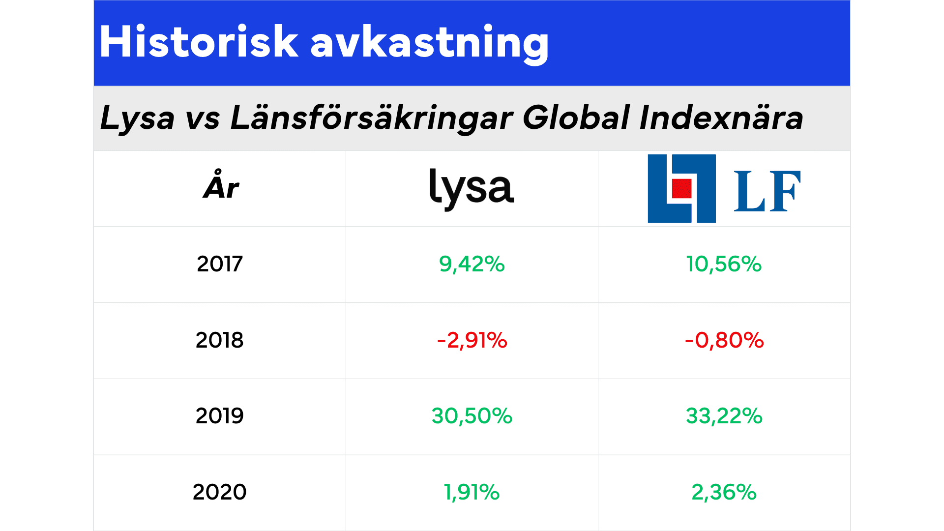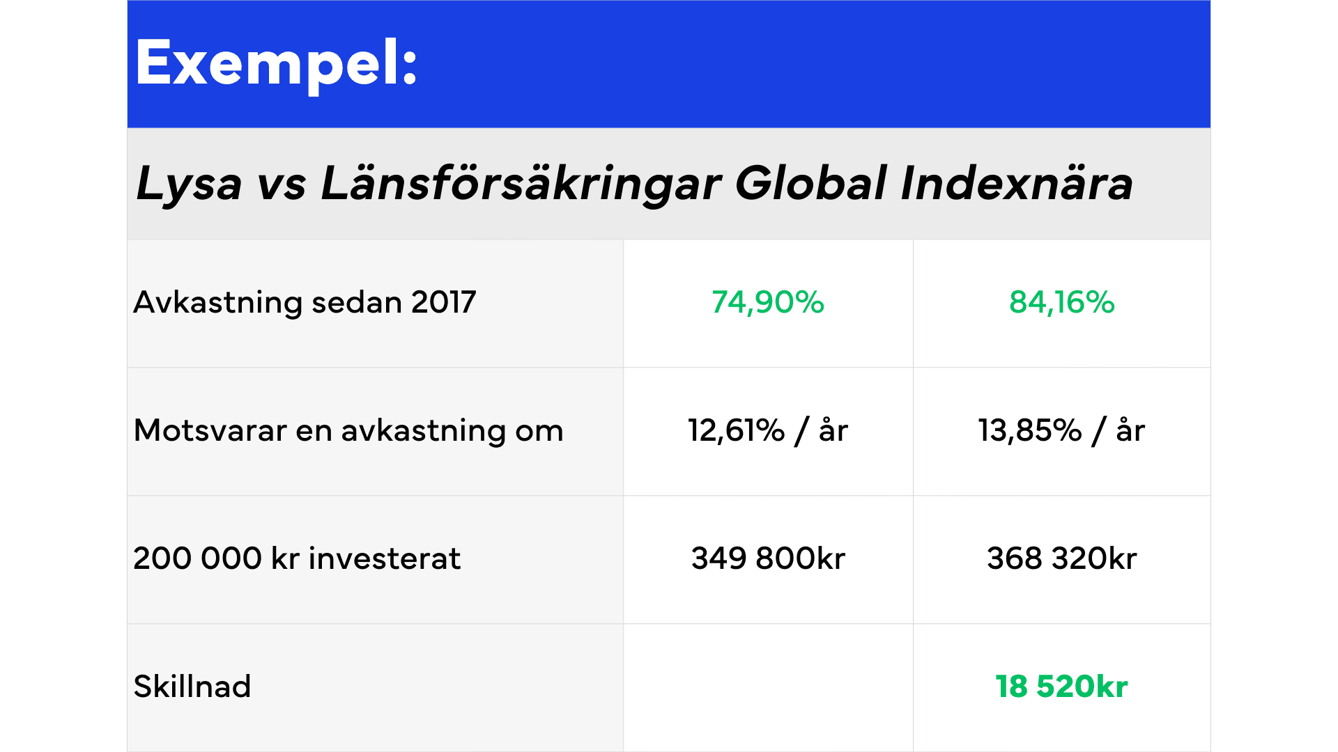 Räkneexemplet ovan visas hur mycket mer du hade fått i avkastning genom en investering genom Länsförsäkringar Global Indexnära än om du hade placerat pengarna har Lysa från och med 2013 då Länsförsäkringars indexvärdet fond startades. Det skall dock kommas ihåg att historisk avkastning inte är någon garanti för framtida avkastning och att utfallet mellan de olika investeringarna kan komma att förändras.
