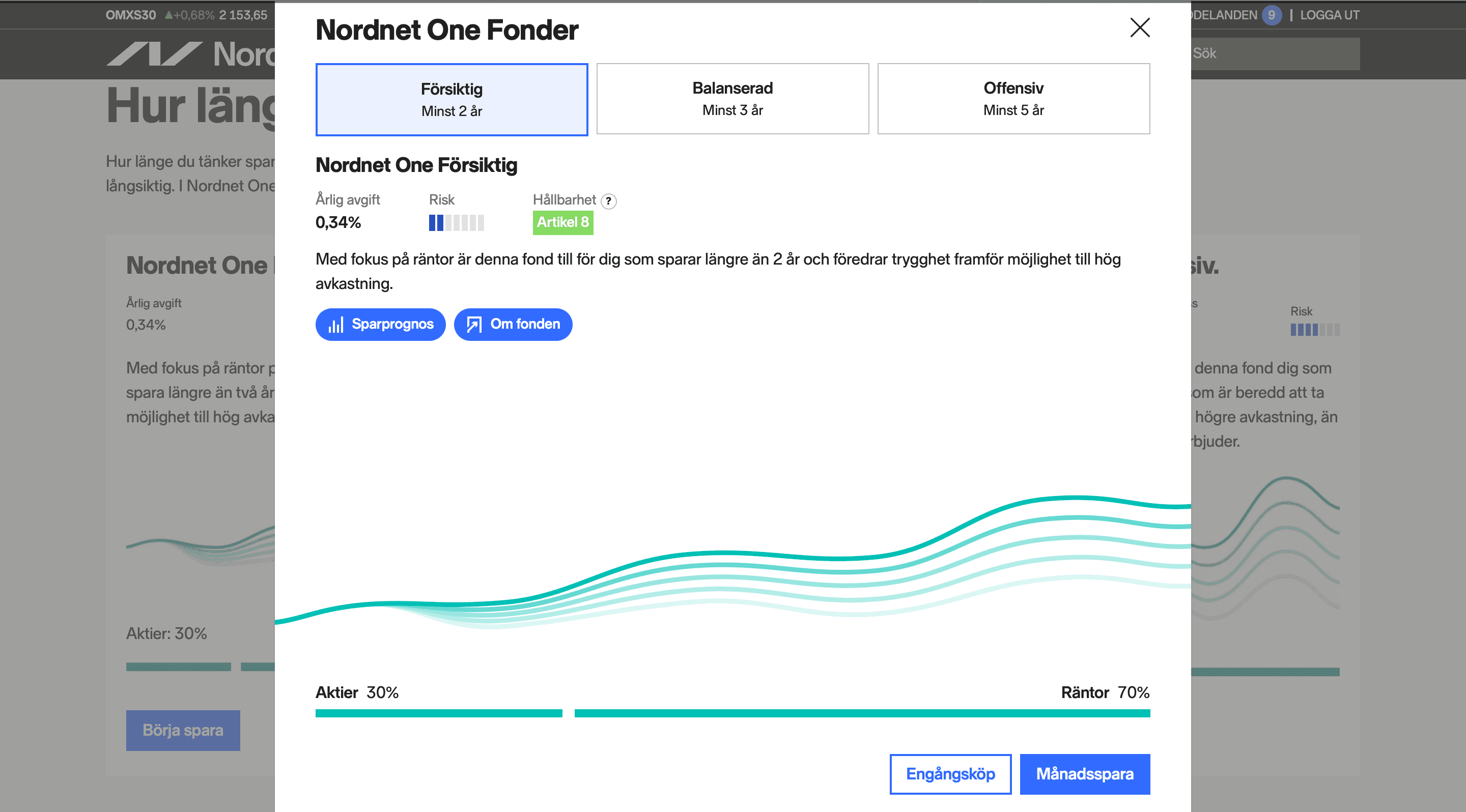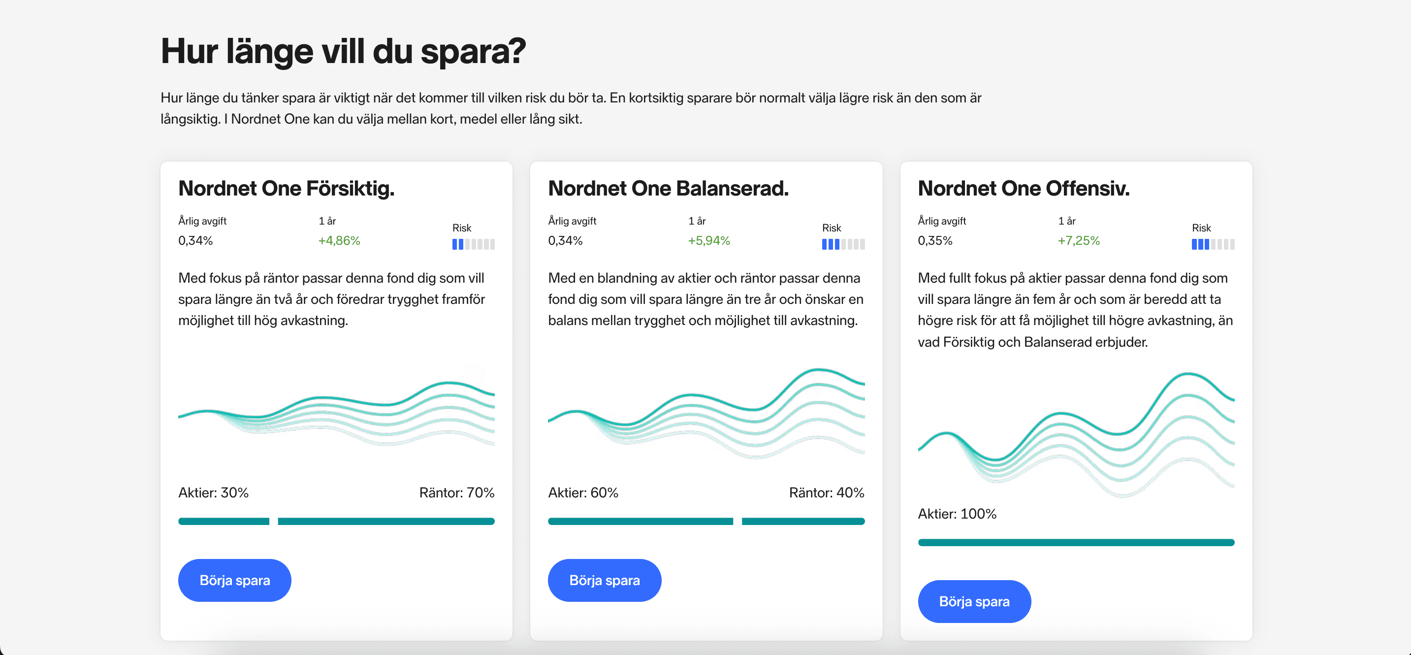 Nordnet One gör det enkelt för användaren att välja en av de tre fonderna med olika risknivå. Dock erbjuder jämförelseverktyget Nordnet One inte någon form av personlig investeringsrådgivning eller oberoende investeringsanalys.
