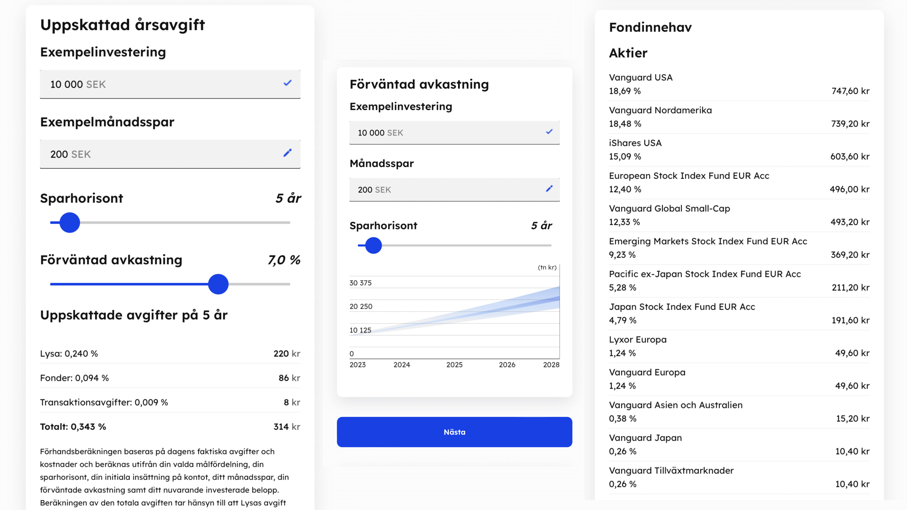De varierar något beroende på fördelningen mellan aktier och räntan på ditt sparande. För större sparbelopp är Lysas förvaltningsavgifter också något lägre.