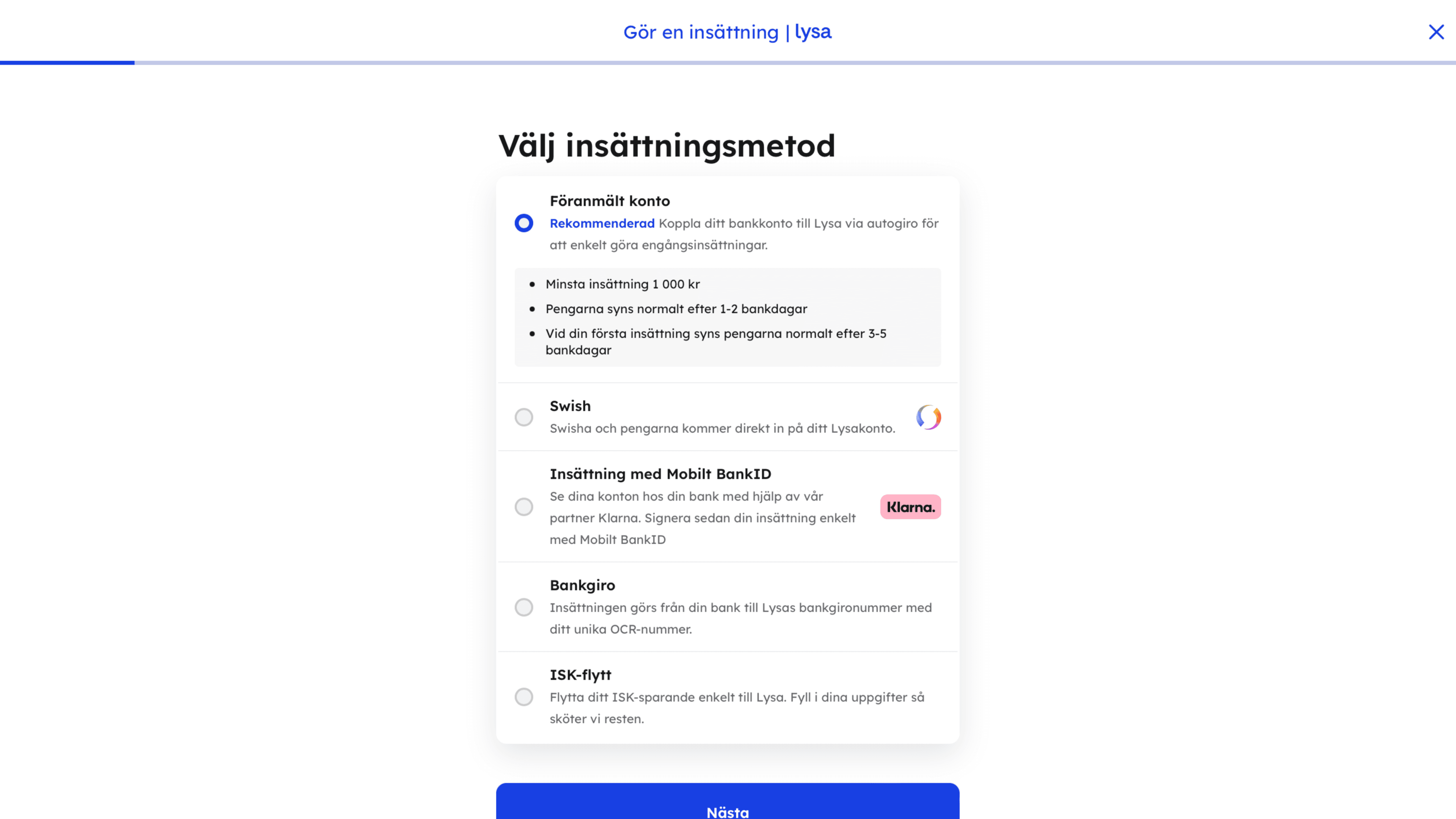För att börja investera måste du sätta in pengar på kontot. Det kan du göra genom flera olika betalningsmetoder. Vi rekommenderar såklart att du även kopplar ditt bankkonto så att du senare kan börja spara automatiskt med ett regelbundet månadssparande.