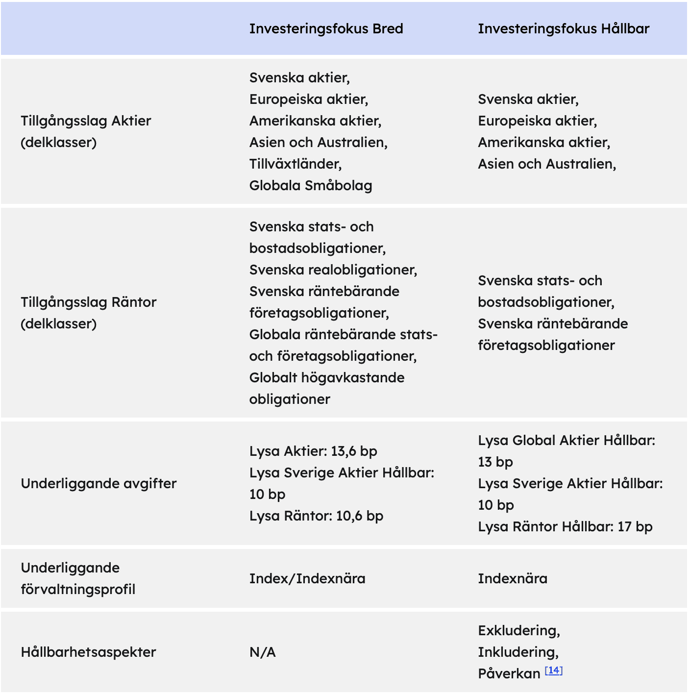 När du investerar hos Lysa investerar du i den investeringsstrategi som Lysa har valt. Den kan vara svår att bedöma på egen hand.