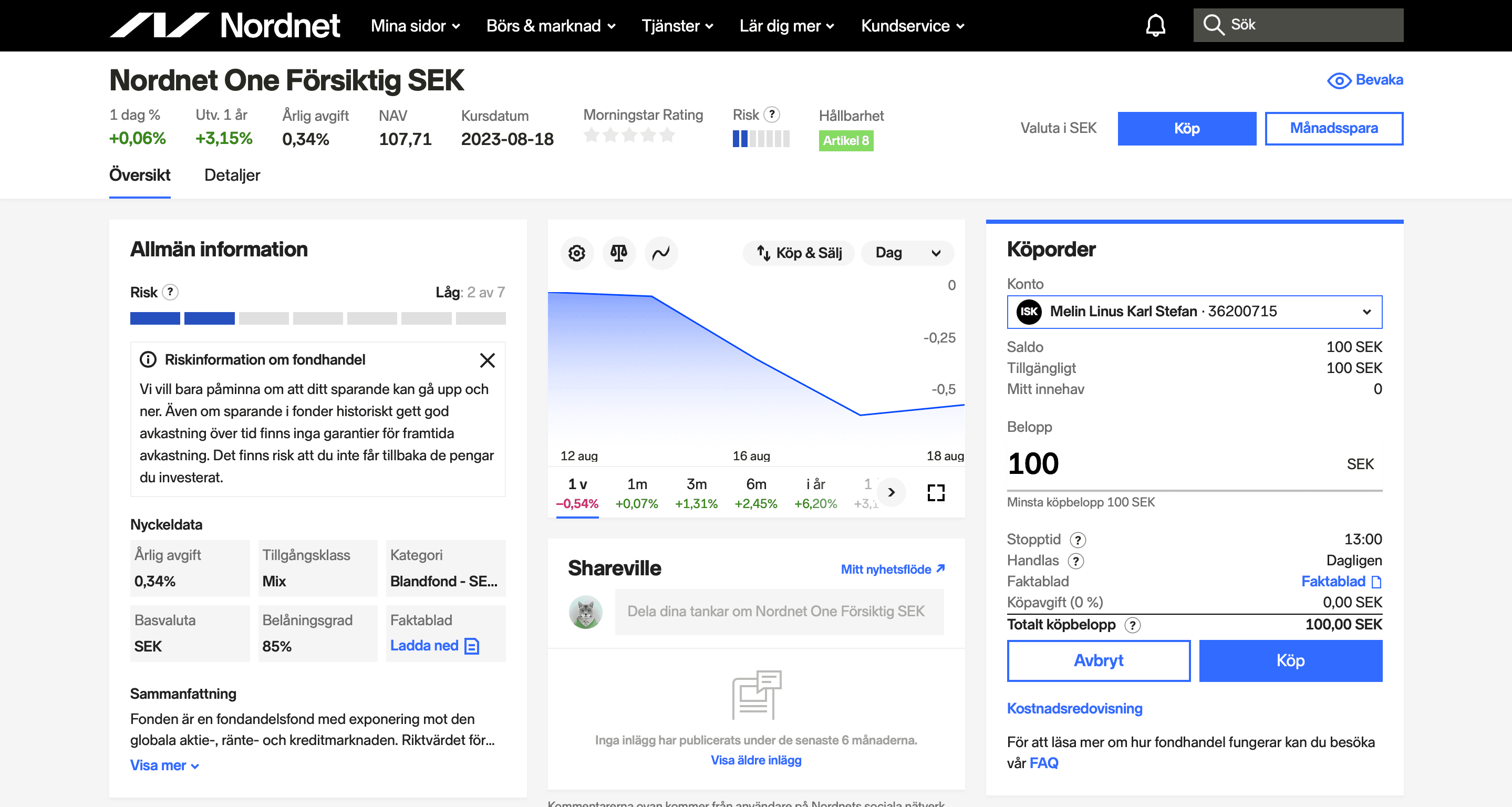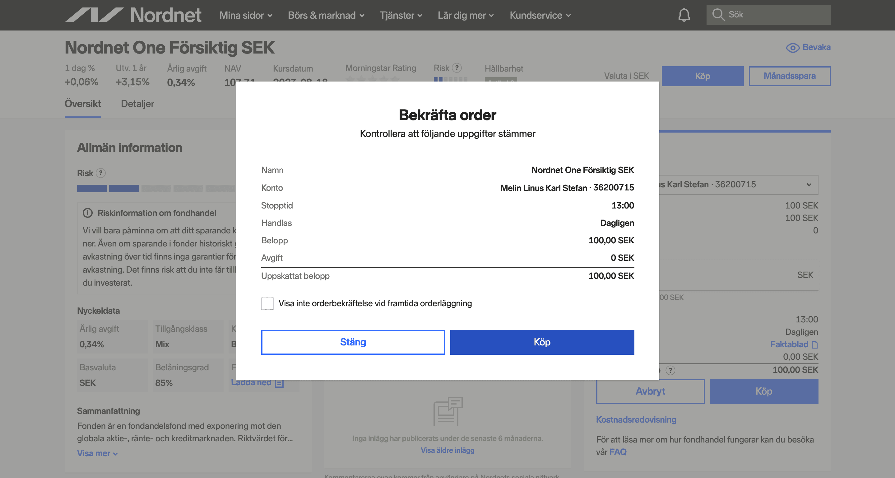 Nordnet Bank AB, ett dotterbolag till Nordnet AB (publ), är den största internetmäklaren i Norden. Nordnet bedriver bland annat bank- och värdepappersrörelse och står under tillsyn av Finansinspektionen. Dina pengar är skyddade enligt insättningsgarantin samt investerarskyddet.